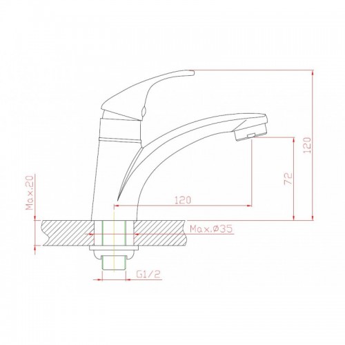 Кран выполнен в классическом хромированном цвете. Он имеет литой излив длиной 120 мм и высотой 70 мм. Установка производится на раковину (настольный монтаж) с креплением на гайку.  Управление осуществляется с помощью однорычажного механизма, что позволяет легко и точно регулировать температуру и напор воды. Наличие каскадного аэратора обеспечивает мягкую, равномерную струю без брызг. В основе конструкции используется керамическая кран-букса — надежный и долговечный механизм, известный своей износостойкостью. Корпус изготовлен из цинка. Комплектация включает гибкую подводку длиной 55 см. На корпус предоставляется гарантия 1 год.