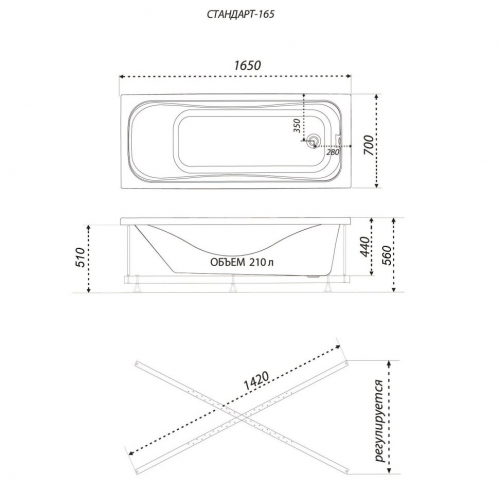 Габариты (Д×Ш×В): 1650 × 700 × 560 мм. Глубина чаши — 440 мм, полезный объём — 210 литров.