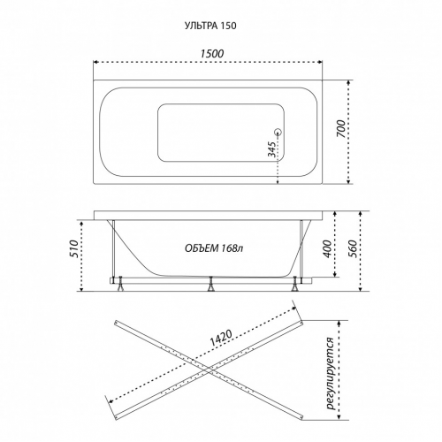Габаритные размеры (ДхШхВ): 1500 × 700 × 560 мм. Глубина чаши — 400 мм, объем — 168 литров.