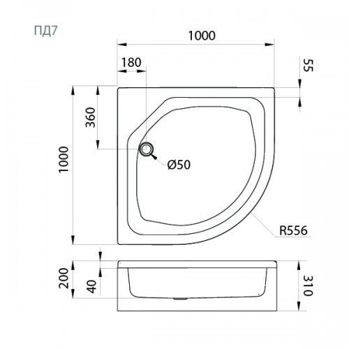 Форма: Полукруглая с радиусом 556 мм, идеально подходит для угловых душевых кабин.
